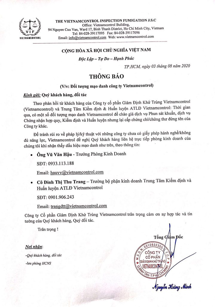 Thông báo về việc đối tượng mạo danh Vietnamcontrol